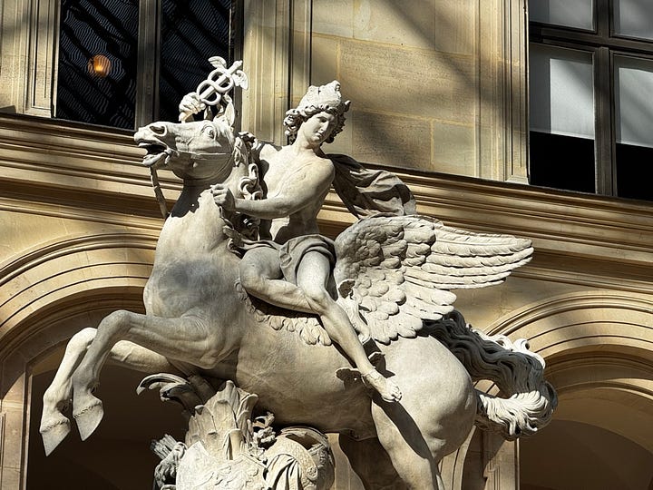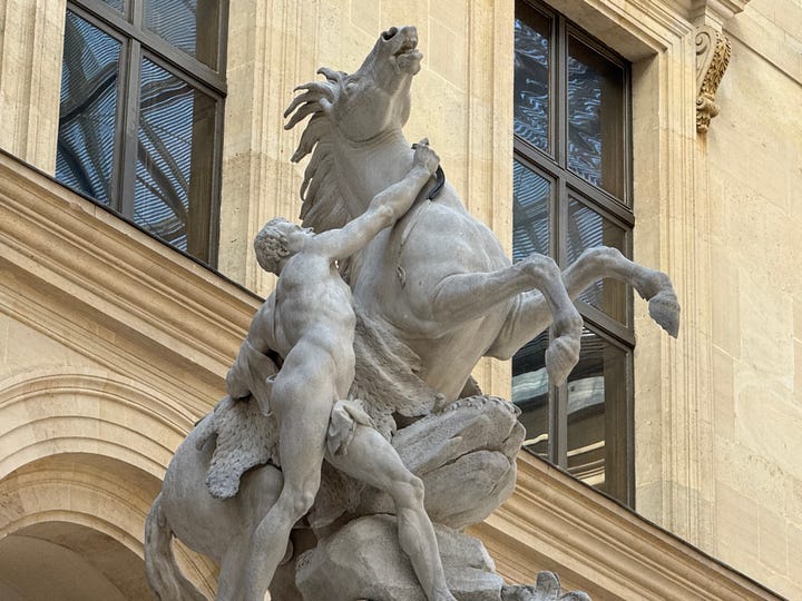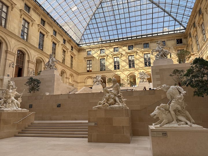 If there are brief glimpses of heaven on earth in places like Patagonia or Yosemite, they can also be found in manmade form within the Marly Court at the Louvre. The glass roof designed by I.M. Pei, the specific quality of light reflecting off the stone, and the arrangement of white marble sculptures provide an appreciation for proportion, material, and the interplay of empty and occupied space. This setting addresses the fundamental questions that architecture and art encourage us to consider.